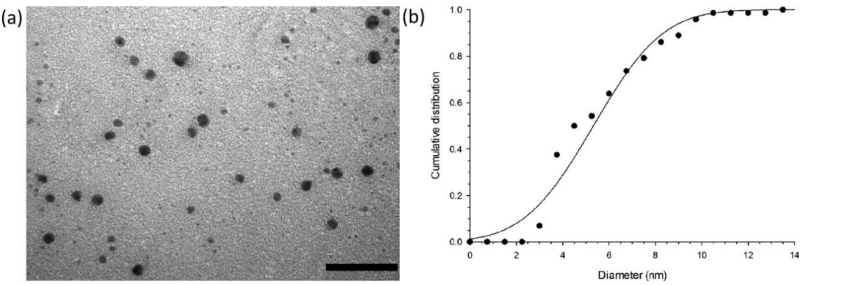 圖1、TEM圖像(Bar等于50 nm)(a)和油酸銀封端NP的直徑累積分布(b)。實(shí)心點(diǎn)為實(shí)驗(yàn)數(shù)據(jù),連續(xù)線為高斯擬合。