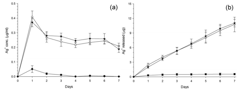 圖4、骨粘固劑中銀離子的釋放。釋放介質(zhì)中的濃度(a)和累積釋放(b)。(C)0.01%,(O)0.05%和(V)0.1%