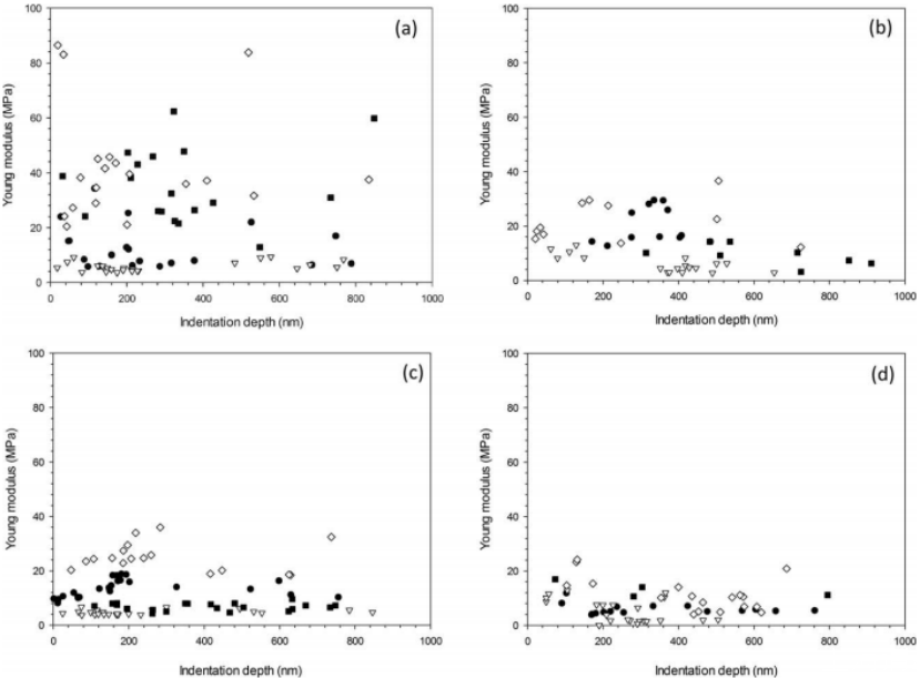 圖5、在PBS中浸泡0小時(shí)(a)、24小時(shí)(b)、2周(c)和4周(d)后,通過(guò)納米壓痕試驗(yàn)測(cè)定含NP的骨水泥的楊氏模量。(●)0%、(▽)0.01%、(實(shí)心正方形)0.05%和(◇)0.1%。