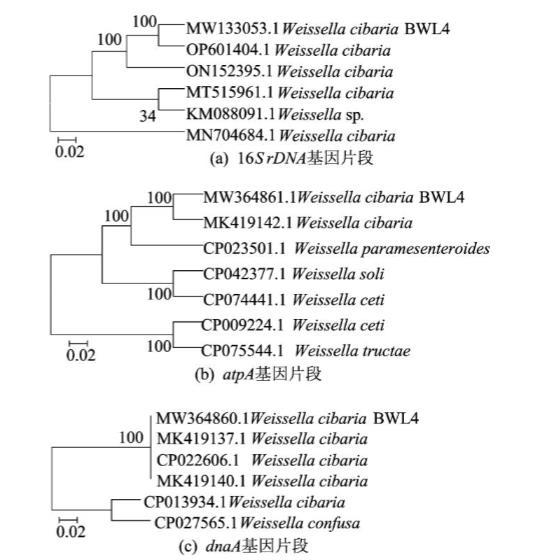 本文將16S rDNA、dnaA、atpA、pheS 基因片段測序得到的基因序列與NCBI數(shù)據(jù)庫進(jìn)行比對,選取同種部分菌屬序列進(jìn)行下載,使用分子進(jìn)化遺傳分析軟件MEGA 7.0,采用Neighbor-Joining法自舉1000次構(gòu)建親緣進(jìn)化樹。