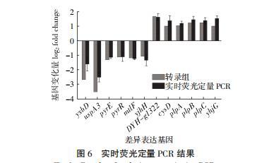 為驗(yàn)證轉(zhuǎn)錄組測(cè)序結(jié)果,對(duì)顯著差異基因進(jìn)行實(shí)時(shí)熒光定量PCR,與轉(zhuǎn)錄組測(cè)序結(jié)果進(jìn)行比較,試驗(yàn)結(jié)果如圖6所示。其中,D-蛋氨酸轉(zhuǎn)運(yùn)結(jié)合蛋白編碼基因plpA、plpB、plpC的相對(duì)表達(dá)量分別為1.20±0.14、1.46±0.22、1.39±0.20;O-乙酰高絲氨酸巰基酶編碼基因cysD表達(dá)量為1.38±0.35;重組DNA修復(fù)蛋白編碼基因DYH_g1322表達(dá)量為1.63±0.25;蛋白N端乙酰基轉(zhuǎn)移酶編碼基因yhjG表達(dá)量為1.54±0.17。結(jié)合圖5可以看出,上述基因表達(dá)量的變化趨勢(shì)與轉(zhuǎn)錄組數(shù)據(jù)一致,證明轉(zhuǎn)錄組數(shù)據(jù)可以作為研究轉(zhuǎn)錄因子RdrA調(diào)控機(jī)制的依據(jù)。