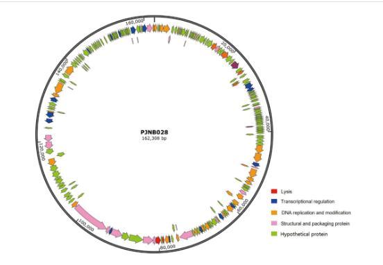 噬菌體PJNB028基因組為雙鏈環(huán)狀DNA,全長(zhǎng)162 308 bp,G+C含量為34%。全基因組BLASTN比對(duì)結(jié)果表明,噬菌體PJNB028與枯草芽孢桿菌噬菌體Bacillus phage 2S-4相似度最高為100%。經(jīng)CARD網(wǎng)站預(yù)測(cè)PJNB028基因組中未發(fā)現(xiàn)耐藥基因、毒力基因。全基因組序列已提交至國(guó)家微生物科學(xué)數(shù)據(jù)中心(National Microbiology Data Center,NMDC),編號(hào)NMDC60203838。