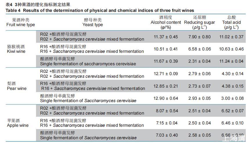 根據(jù)GB/T 15038-2006和《葡萄酒、果酒通用分析方法》,測定釀酒酵母單菌發(fā)酵、R02與釀酒酵母發(fā)酵、R16與釀酒酵母混菌發(fā)酵釀造的獼猴桃酒、梨酒、蘋果酒的理化指標,結(jié)果見表4。R02、R16混菌發(fā)酵的果酒,其酒精度、還原糖含量、總酸含量均能符合果酒釀造的生產(chǎn)需要。相對酵母單菌發(fā)酵,混菌發(fā)酵的獼猴桃酒的還原糖殘?zhí)秋@著提高,其他變化不明顯;混菌發(fā)酵的梨酒的總酸含量均顯著上升,還原糖殘?zhí)呛可燥@降低,酒精度變化不明顯;R02混菌發(fā)酵的蘋果酒的酒精度稍顯提高,其他變化不顯著。綜上,菌株R02和R16可作為果酒釀造的優(yōu)質(zhì)產(chǎn)香酵母,在果酒釀造的生產(chǎn)中具有較好的應用前景。