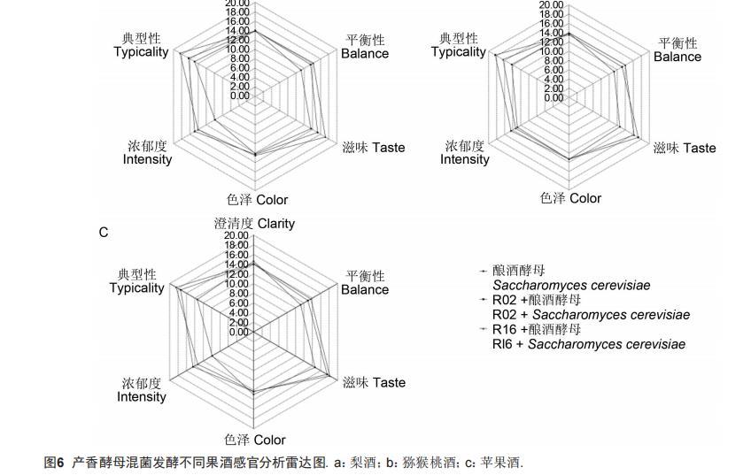 感官評價是評定果酒品質(zhì)的重要極指標,選擇R02、R16分別與釀酒酵母混菌發(fā)酵梨酒、獼猴桃酒、蘋果酒,對果酒的澄清度、典型性、滋味、平衡性、濃郁度和色澤6個方面進行感官分析以及與釀酒酵母單菌發(fā)酵果酒進行綜合對比,結(jié)果如圖6所示:在3種果酒中,R02、R16混菌發(fā)酵果酒均相對于釀酒酵母單菌發(fā)酵果酒在典型性、滋味、平衡性、濃郁度4個方面有顯著提升,其中在典型性、滋味方面提升最為顯著。綜上所述,R02與釀酒酵母混菌發(fā)酵和R極16與釀酒酵母混菌發(fā)酵果酒均能有效提升果酒的感官品質(zhì),但在不同原料的極果酒各有側(cè)重,主要從果酒的典型性和滋味來看,R16與釀酒酵母混菌發(fā)酵梨酒、蘋果酒較R02表現(xiàn)更突出,R02與釀酒酵母混菌發(fā)酵獼猴桃酒較R16表現(xiàn)更突出。