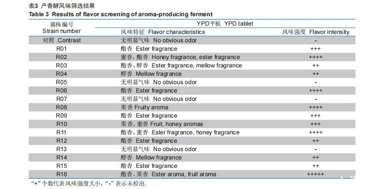 嗅聞YPD固體培養(yǎng)基表面生長的酵母菌氣味,產(chǎn)香酵母風味篩選結(jié)果見表3:不同產(chǎn)香酵母菌株的氣味及強度有明顯差異,R05、R07、R13無明顯風味;R03、R04、R12、R14、R15風味強度較弱,表現(xiàn)為淡淡的酯香和醇香;R01、R02、R06、R08、R09、R10、R11、R16具有較濃厚的酯香、醇香、果香和蜜香,香氣宜人。綜上,初篩出R01、R02、R06、R08、R09、R10、R11、R16產(chǎn)香酵母菌株進行下一步復篩。
