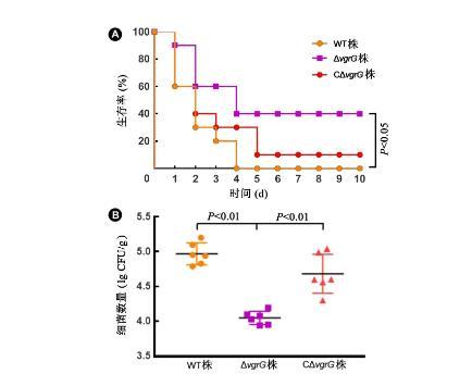 以致死劑量Kpn感染小鼠觀察10 d內存活率,WT株組小鼠存活率顯著低于ΔvgrG株組[(16.67±8.82)%vs(53.33±6.67)%,t=3.32,P<0.05];以半致死劑量Kpn感染小鼠,WT株組小鼠肺臟細菌數(shù)顯著多于ΔvgrG株組[(4.97±0.06)lg CFU/g vs(4.05±0.04)lg CFU/g,t=12.27,P<0.01],CΔvgrG株組小鼠肺臟細菌數(shù)也顯著多于ΔvgrG株組(P<0.01),以上結果提示vgrG參與了Kpn對小鼠的致病性(圖5)。