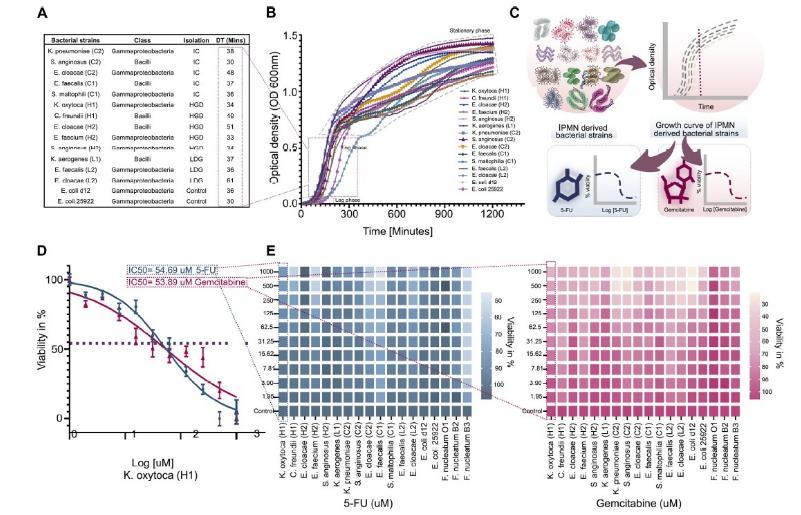 圖1、IPMN衍生菌株對(duì)5-氟尿嘧啶(5-FU)和吉西他濱的敏感性表征。A)IPMN衍生細(xì)菌菌株的分類、分離來(lái)源以及倍增時(shí)間(DT),以及對(duì)照菌株大腸桿菌(E.coli)d12和E.coli 25922。B)IPMN衍生細(xì)菌菌株和對(duì)照菌株的生長(zhǎng)曲線。x軸表示時(shí)間(分鐘),y軸表示在600 nm處的吸光度(OD)(平均值±標(biāo)準(zhǔn)差,n=3)。C)確定選定IPMN衍生菌株的半數(shù)抑制濃度(IC50)值的實(shí)驗(yàn)設(shè)計(jì)示意圖,以E.coli d12、E.coli 25922和福賽坦菌(F.nucleatum)菌株作為對(duì)照。D)代表性劑量反應(yīng)曲線,用于計(jì)算IPMN衍生的K.oxytoca(H1)在腦心浸液(BHI)培養(yǎng)基中孵育24小時(shí)后的IC50值。數(shù)據(jù)經(jīng)過(guò)歸一化、對(duì)數(shù)轉(zhuǎn)換,并使用Gompertz方程擬合。E)熱圖顯示了個(gè)別細(xì)菌菌株對(duì)5-FU和吉西他濱兩倍稀釋濃度的反應(yīng)活性?;钚砸韵鄬?duì)于未處理對(duì)照組(設(shè)定為100%)的存活率百分比表示(平均值±標(biāo)準(zhǔn)差,n=3)。左側(cè)為5-FU,右側(cè)為吉西他濱。