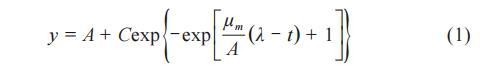 其中,A:細(xì)菌初始數(shù)量;C:細(xì)菌初始數(shù)量和最大數(shù)量之間的差值;μ_m:最大比生長率;λ:菌株生長滯后時間。將獲得的A值和培養(yǎng)時間的數(shù)據(jù)分別代入上述公式中的y和t,得到生長擬合曲線。