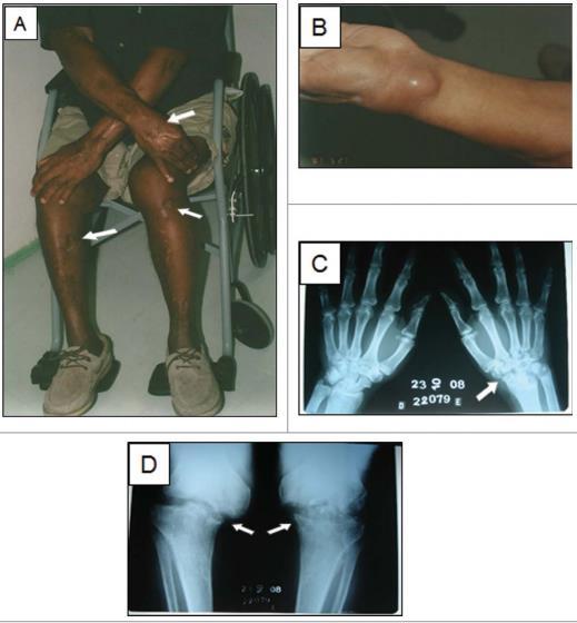 一名61歲的退休磚瓦工,患有糖尿病和高血壓,因6年皮膚病變病史被轉(zhuǎn)診至巴西里約熱內(nèi)盧埃萬(wàn)德羅·沙加斯國(guó)家傳染病研究所(INI)的感染性皮膚病學(xué)實(shí)驗(yàn)室。初步診斷后,他接受了5個(gè)月的碘化鉀治療,導(dǎo)致皮膚病變愈合。然而,他抱怨膝蓋和左腕關(guān)節(jié)疼痛逐漸加重,以至于在到INI就診前2年需要輪椅。在我們INI評(píng)估前6個(gè)月,他注意到皮膚病變復(fù)發(fā)。