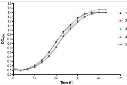 由于我們發(fā)現(xiàn)分離株5在大蠟螟中的毒力與其他分離株不同,我們?cè)u(píng)估了與毒力相關(guān)的因素是否可以解釋這種變化的原因。在37°C下使用Christensen尿素肉湯測(cè)定脲酶產(chǎn)量,所有5株分離株在4天和7天后均為陽(yáng)性,559 nm處的平均吸光度沒有差異。通過(guò)測(cè)量瓊脂上azoalbumin降解暈圈確定的蛋白酶活性范圍從0.6到0.76,分離株1的活性最高(p/z=0.6)。該活性與分離株2(p=0.016)和分離株4(p=0.0005)有顯著差異。分離株產(chǎn)生的DHN-黑色素比例(通過(guò)干重DHN-黑色素/干重酵母比率獲得)沒有統(tǒng)計(jì)學(xué)差異。所有分離株在35和37°C下生長(zhǎng),在39°C下均不生長(zhǎng)。此外,分離株在BHI培養(yǎng)基中的生長(zhǎng)曲線相似,它們之間沒有統(tǒng)計(jì)學(xué)差異(P>0.05;圖5)。對(duì)于氧源性物質(zhì)的暴露,分離株2在暴露4小時(shí)時(shí)生長(zhǎng)抑制最高,這與分離株3和分離株4有顯著差異(P<0.05)(圖6A)。