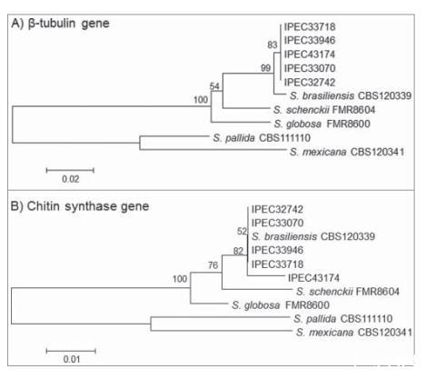 基本局部比對(duì)搜索工具(BLAST)分析將分離株的部分β-微管蛋白(β-tub)和幾丁質(zhì)合酶(CHS)序列與NCBI GenBank數(shù)據(jù)庫(kù)(AM116954,AM116950,AM116956,AM116946,AM114898,AM117414,AM114889,和AM117417)中的分離株進(jìn)行比較,以99-100%的相似性將這些分離株鑒定為巴西孢子絲菌。此外,將從所有分離株獲得的部分β-tub和CHS序列與GenBank數(shù)據(jù)庫(kù)中可用的孢子絲菌復(fù)合體參考菌株進(jìn)行比較和系統(tǒng)發(fā)育分析,結(jié)果顯示與巴西孢子絲菌相似,并且兩個(gè)基因都顯示出高bootstrap支持值(圖3A和B)。分離株5的部分CHS序列與前4株分離株相比有一個(gè)2-bp的多態(tài)性(位置109 A/C和151 G/C),表明該分離株在系統(tǒng)發(fā)育分析中存在變異性。獲得的β-tub和CHS編碼基因序列已存入GenBank數(shù)據(jù)庫(kù),登錄號(hào)為KM222420至KM222429。