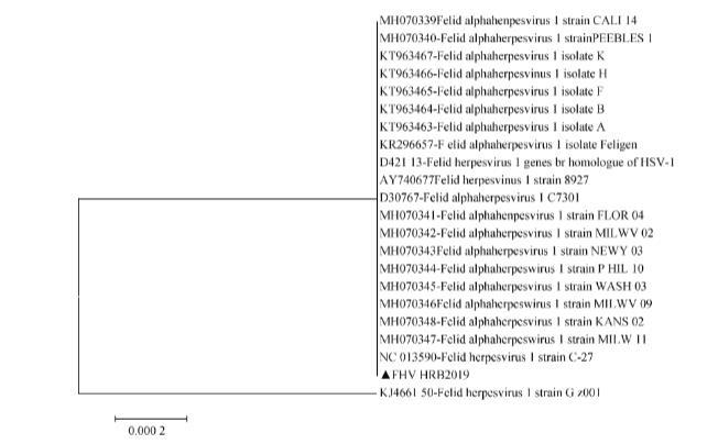 將HRB2019株與國(guó)內(nèi)外流行的FHV-1毒株gD基因核酸序列進(jìn)行核苷酸同源性及遺傳進(jìn)化分析,結(jié)果顯示,HRB2019株(▲表示)與GenBank收錄的國(guó)內(nèi)外貓?jiān)碏HV-1流行株核苷酸同源性100%,但與一株虎源的廣東分離株親緣關(guān)系較遠(yuǎn)(KJ466150),核苷酸同源性為99.8%,說(shuō)明FHV-1的宿主特異性較高(圖5)。