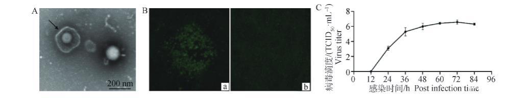 A.HRB2019分離株電鏡觀察結(jié)果。B.HRB2019分離株的IFA鑒定結(jié)果(200×):a.感染HRB2019株的CRFK細(xì)胞;b.正常CRFK細(xì)胞。C.HRB2019分離株生長(zhǎng)動(dòng)力曲線