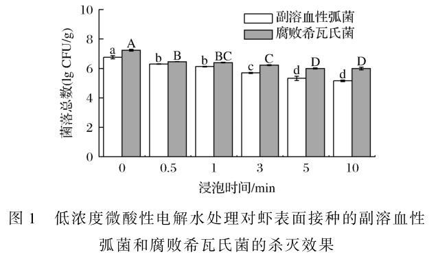 圖1 低濃度微酸性電解水處理對蝦表面接種的副溶血性弧菌和腐敗希瓦氏菌的殺滅效果