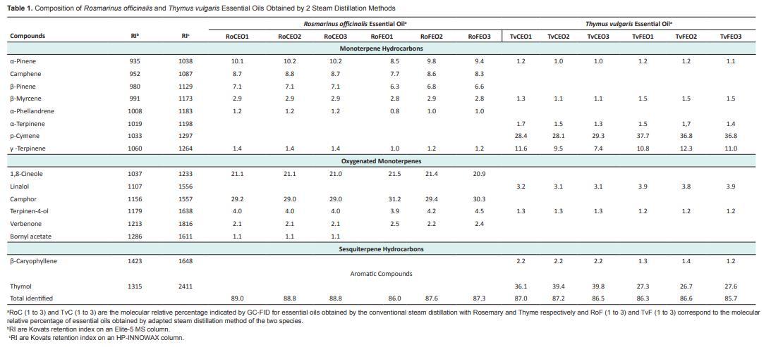 在6批百里香精油中,鑒定出9種化合物,在蒸汽蒸餾獲得的精油中占86.5%至87.2%,在適應(yīng)式蒸汽蒸餾獲得的精油中占85.7%至86.6%。在蒸汽蒸餾和適應(yīng)式蒸汽蒸餾獲得的水餾液中,鑒定出5種化合物,分別占80.3%至87.5%和88.4%至93.1%。