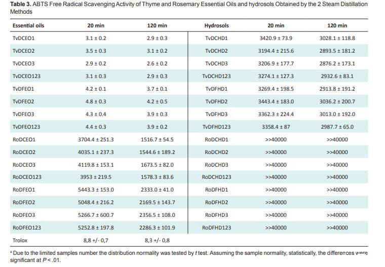 在通過蒸汽蒸餾獲得的百里香精油和通過適應(yīng)式蒸汽蒸餾獲得的百里香精油的抗氧化活性之間觀察到顯著差異,可能是由于前者的百里香酚相對(duì)濃度(介于36.1%和39.8%之間)高于后者(介于26.7%和27.6%之間)。然而,在通過蒸汽蒸餾獲得的水餾液和通過適應(yīng)式蒸汽蒸餾獲得的水餾液之間未觀察到顯著差異,它們呈現(xiàn)出一致的behavior,在來自2種蒸餾方法的各批次內(nèi)部和之間均如此。不同百里香水餾液獲得的IC??與Aazza等人獲得的相似:在6分鐘時(shí),對(duì)于香芹酚化學(xué)型的百里香水餾液,為3000 mg/mL。