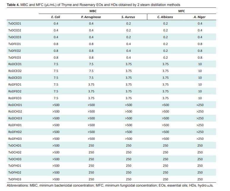 通過2種蒸汽蒸餾方法獲得的精油和水餾液的最低殺菌濃度和最低抑菌濃度如表4所示。迷迭香水餾液在高達(dá)500μL/mL時(shí)對(duì)測試的細(xì)菌和真菌均未呈現(xiàn)任何活性。所有通過2種不同蒸餾方法獲得的迷迭香精油顯示出相同的最低殺菌濃度,除了對(duì)P.aeruginosa(銅綠假單胞菌)之外。與抗氧化活性(顯示常規(guī)蒸汽蒸餾獲得的精油效果更好)相反,通過FARMAVERDE蒸汽蒸餾獲得的迷迭香精油對(duì)該假單胞菌種顯示出最低的MBC。然而,迷迭香精油針對(duì)不同菌株的這些最低殺菌濃度與所有百里香油獲得的濃度相比都很低,后者顯示活性在0.2至0.8μL/mL之間。