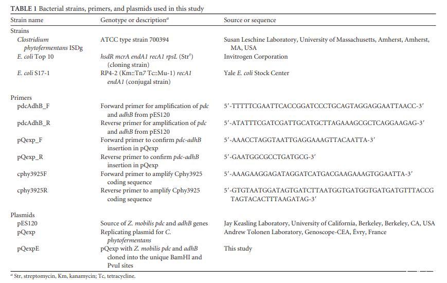 C. phytofermentans乙醇耐受性(ET)菌株通過連續(xù)傳代(1:50稀釋)到含有10 ml補充了遞增乙醇濃度的GS2培養(yǎng)基的培養(yǎng)管中進行篩選。從在4%(體積/體積)(31.5 g liter-1)乙醇中的培養(yǎng)物開始,每周傳代到含有相同乙醇濃度和乙醇濃度高1%的新鮮培養(yǎng)基中。如果在較高濃度下1周后未觀察到生長,則培養(yǎng)物重新傳代到相同的乙醇濃度。如果培養(yǎng)物在較高乙醇濃度下生長,則該培養(yǎng)物再次傳代到該乙醇濃度和高1%的乙醇濃度。在7次每周傳代后觀察到在5%乙醇中生長,13次傳代后在6%乙醇中生長,19次傳代后在7%乙醇中生長。每次乙醇耐受性提高時,將細胞鋪板,挑取單個菌落,并重新接種液體培養(yǎng)物,以確保選擇是基于一株具有提高的乙醇耐受性的特定菌株,而不是基于一個共同在提高的乙醇濃度下存活的菌株聯盟。因此,ET菌株是從在補充了7%(體積/體積)乙醇的GS2培養(yǎng)基中生長的母培養(yǎng)物中通過菌落純化分離得到的。經菌落純化后,確認ET菌株具有與母培養(yǎng)物相似的乙醇抗性。
