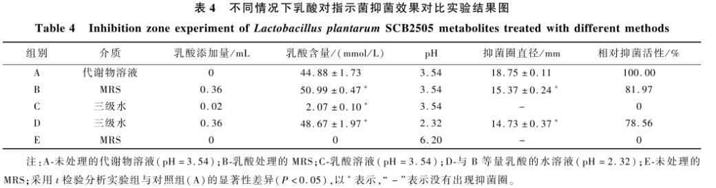 由表4可知,植物乳桿菌SCB2505代謝物具有較好的抑菌活性,抑菌圈直徑達(dá)到(18.75±0.11)mm(A)。MRS液體培養(yǎng)基(E)不具有抑菌活性,但用乳酸將MRS調(diào)至與A組相同的pH(B)時,抑菌圈直徑達(dá)到(15.37±0.24)mm,其抑菌活性大大提高,與對照組(A)比較相對抑菌活性為81.97%。但是,與A組(植物乳桿菌SCB2505代謝物組)相同pH的乳酸水溶液(C)不具有抑菌圈,而添加與B組相同乳酸添加量的水溶液(D)抑菌圈直徑達(dá)到(14.73±0.37)mm,與B組不具有顯著性差異(P>0.05)。由此可見,在中酸性環(huán)境下,氫離子濃度(即pH值)并不是影響代謝物抑菌活性的主要原因,其抑菌活性主要是乳酸所起的作用。在相同pH值下,低濃度的乳酸水溶液不具有抑菌活性,而在MRS體系中,由于乳酸與MRS中的緩沖物質(zhì)中和,導(dǎo)致乳酸根離子累積,隨著pH下降,氫離子與乳酸根離子反應(yīng)形成未解離的乳酸,乳酸濃度超過閾值,從而使其產(chǎn)生抑菌活性。據(jù)報道,未解離的乳酸具有親脂性,能過穿過細(xì)胞膜,在細(xì)菌內(nèi)釋放氫離子,降低細(xì)菌內(nèi)pH值,進(jìn)而影響細(xì)菌的生長速度。此外,乳酸還可以通過破壞酶、抑制蛋白質(zhì)合成、中斷營養(yǎng)吸收、破壞細(xì)胞壁和細(xì)胞膜的亞結(jié)構(gòu)和功能來影響細(xì)胞代謝,破壞細(xì)胞生長。