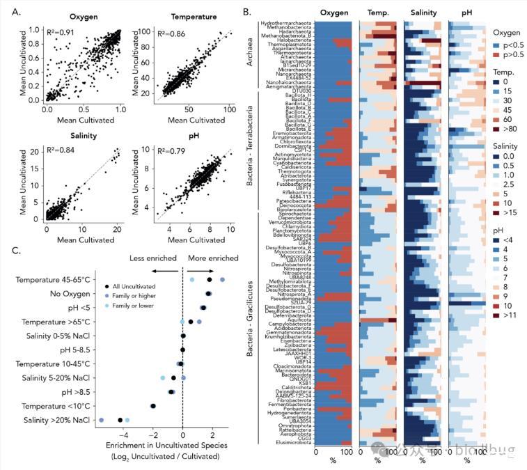 未培養(yǎng)微生物的新發(fā)現(xiàn):預(yù)測顯示,未培養(yǎng)物種更傾向極端環(huán)境(如高溫厭氧、高酸),暗示實(shí)驗(yàn)室培養(yǎng)條件的設(shè)計(jì)需突破常規(guī)思路。