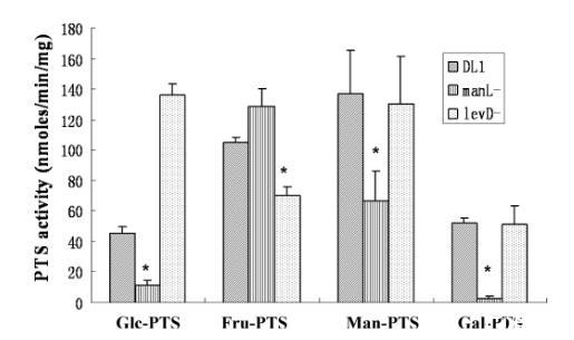 為了驗(yàn)證ManL和LevD在糖轉(zhuǎn)運(yùn)中的作用,將DL1以及manL和levD突變體在含有0.5%葡萄糖、果糖、甘露糖或半乳糖的TV中進(jìn)行厭氧培養(yǎng)。在指數(shù)中期收集細(xì)胞,并分別使用葡萄糖、果糖、甘露糖或半乳糖作為底物測(cè)量PTS比活性。與DL1菌株相比,manL突變體對(duì)葡萄糖、甘露糖和半乳糖的PTS活性顯著降低,但對(duì)果糖的活性略有增加。levD突變體對(duì)果糖的PTS活性顯著降低,對(duì)葡萄糖的活性顯著升高,而對(duì)甘露糖和半乳糖的PTS活性變化很?。▓D2)。這些結(jié)果進(jìn)一步支持ManL參與葡萄糖、半乳糖和甘露糖的轉(zhuǎn)運(yùn),并且可能也參與果糖的利用,而LevD似乎主要負(fù)責(zé)果糖的內(nèi)化。