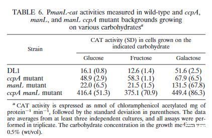 CcpA負(fù)向調(diào)節(jié)manL表達(dá)。由于我們已經(jīng)證明破壞CcpA會(huì)導(dǎo)致大多數(shù)條件下fruA和levD表達(dá)降低(表3和4),并且ManL的缺失通常導(dǎo)致CCR的解除,因此CcpA可能通過調(diào)節(jié)manL間接影響CCR,這似乎是變形鏈球菌中的情況(54)。將ccpA缺失引入manL突變株,并監(jiān)測(cè)雙突變體背景中PfruA-和PlevD-cat融合的表達(dá)。當(dāng)在補(bǔ)充了0.5%葡萄糖、果糖、半乳糖、菊粉或甘露糖的TV中生長(zhǎng)時(shí),ccpA manL雙突變體產(chǎn)生的CAT活性顯著高于野生型菌株或ccpA突變體(表3和4)。與僅攜帶manL突變的菌株相比,在ccpA manL雙突變體中觀察到的去抑制水平相似。然而,當(dāng)使用半乳糖或甘露糖培養(yǎng)細(xì)胞時(shí),雙突變體顯示出較低的活性(表3和4)。這些結(jié)果支持了CcpA可能通過影響細(xì)胞中ManL的量來(lái)影響fruA和levD表達(dá)的觀點(diǎn)。