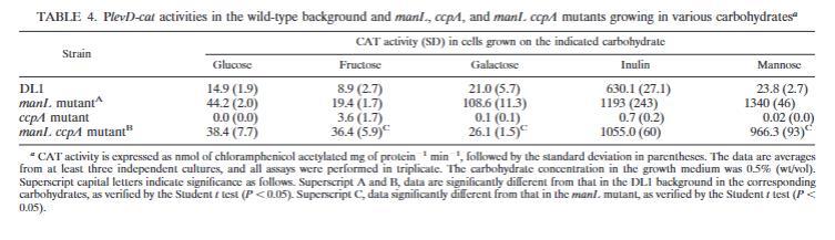 當(dāng)在manL突變體背景下使用PfruA-cat和PlevD-cat融合測(cè)量fruA和levD基因表達(dá)時(shí)(表3和4),在所有測(cè)試的碳水化合物中,這兩個(gè)基因相對(duì)于野生型背景中的表達(dá)水平均出現(xiàn)去抑制。根據(jù)levD表達(dá)的數(shù)據(jù),在甘露糖培養(yǎng)物中觀察到的去抑制水平最高。雖然在葡萄糖和半乳糖中觀察到相似的表達(dá)變化倍數(shù),但在果糖作為生長(zhǎng)碳水化合物時(shí),ManL缺陷菌株中觀察到的去抑制量最低。當(dāng)細(xì)胞在TV-菊粉中生長(zhǎng)時(shí),與野生型背景相比,在manL突變株中觀察到兩個(gè)基因的去抑制約為3倍。