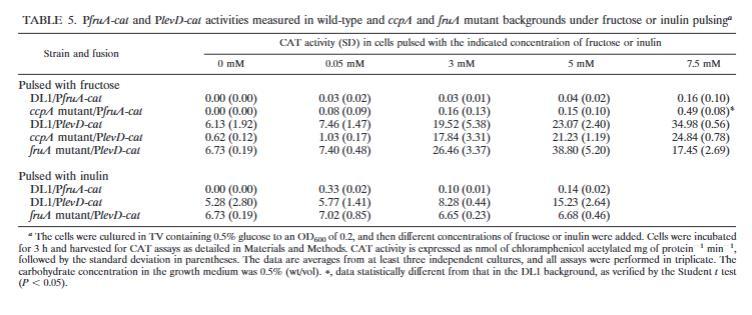 可以觀察到CcpA對(duì)fruA表達(dá)的抑制效應(yīng),但對(duì)levD沒有。在變形鏈球菌中,fruA和levD操縱子的表達(dá)由四組分調(diào)節(jié)系統(tǒng)LevQRST控制,該系統(tǒng)感應(yīng)誘導(dǎo)底物果糖或甘露糖的存在。由于相對(duì)占主導(dǎo)地位的CcpA非依賴性CCR機(jī)制的調(diào)節(jié),通過CcpA對(duì)變形鏈球菌fruA的CCR僅在果糖脈沖實(shí)驗(yàn)中監(jiān)測(cè)表達(dá)時(shí)才明顯(3)。也就是說,只有當(dāng)細(xì)胞在非誘導(dǎo)碳水化合物中生長(zhǎng)到指數(shù)中期,然后對(duì)培養(yǎng)物進(jìn)行1到3小時(shí)的誘導(dǎo)劑脈沖時(shí),才能觀察到CcpA介導(dǎo)的CCR證據(jù)。在類似的實(shí)驗(yàn)中,攜帶PfruA-cat或PlevD-cat融合的戈登氏鏈球菌在含有0.5%葡萄糖的TV中孵育至指數(shù)早期(OD600≈0.2),然后用不同濃度的果糖或菊粉處理3小時(shí),然后收獲進(jìn)行CAT測(cè)定。如表5所示,當(dāng)果糖濃度從0.05 mM增加到7.5 mM時(shí),fruA表達(dá)增加了約5倍,PlevD-cat菌株對(duì)果糖的存在有明顯的劑量依賴性反應(yīng)(表5)。類似地,當(dāng)使用菊粉脈沖這些菌株時(shí),隨著菊粉的添加,levD的表達(dá)出現(xiàn)濃度依賴性增加。