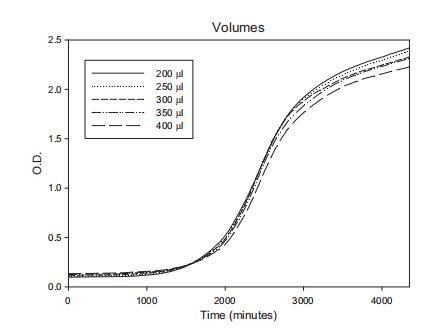 檢查不同體積YES培養(yǎng)基含10^5孢子/毫升黃曲霉以確定最佳使用體積。鑒于最大孔體積為500μl,測(cè)試體積為200、250、300、350和400μl。平均生長(zhǎng)曲線(每種處理十個(gè)重復(fù))顯示盡管使用最高體積是最低量的兩倍,曲線非常相似(圖4)。此外,不同平均曲線RMSE值之間未發(fā)現(xiàn)差異,范圍從0.097到0.132。