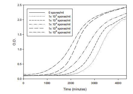 圖3顯示在YES培養(yǎng)基中接種不同孢子濃度(10^2-10^6孢子/毫升)后獲得的平均O.D./時(shí)間曲線(十個(gè)個(gè)體曲線)。為研究重復(fù)間變異性,獲得曲線平均的均方根誤差(RMSE)。結(jié)果表明較低孢子負(fù)載導(dǎo)致較高曲線分散(RMSE;1x10^2孢子/毫升=0.357;1x10^3孢子/毫升=0.286),而當(dāng)使用較高濃度時(shí)分散較?。≧MSE;1x10^5孢子/毫升=0.118;1x10^6孢子/毫升=0.151)。非常高濃度孢子產(chǎn)生初始O.D.輕微增加?;谶@些結(jié)果,選擇最終接種物1x10^5孢子/毫升用于所有后續(xù)實(shí)驗(yàn)。
