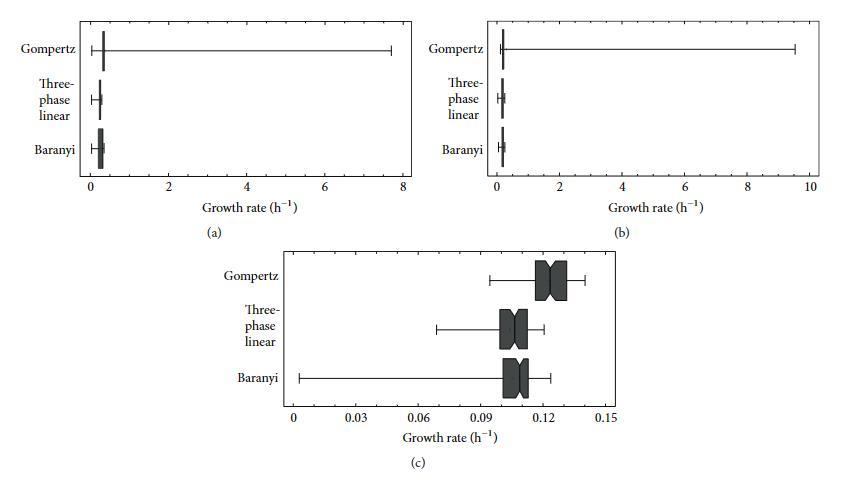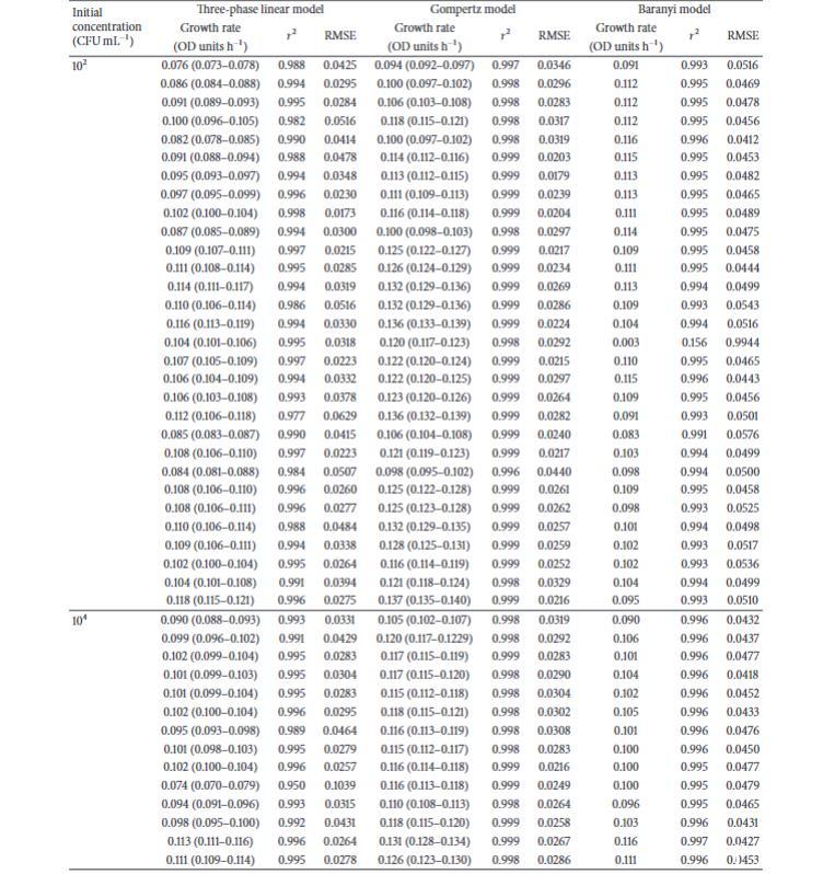 我們的結(jié)果表明,Baranyi模型和三相線性模型在分析相似生長曲線時,都為生長率值提供了較低的變異性,因此是首選模型。三相線性模型給出了生長率的最低變異,而Baranyi模型給出的變異略高,盡管其整體擬合效果要好得多。