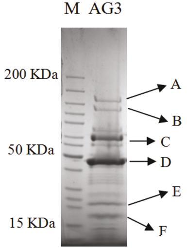 氯化銫純化的 SboM-AG3 病毒粒子通過一維 SDS-PAGE 分析,顯示出 15 個(gè)蛋白條帶(圖 4),分子量分別為 12.7、15.6、17.7、21.9、27.2、32.4、34.3、35.7、37.3、44.6、60.4、67.9、76.5、107.5 和 126.3 kDa,基于與大小標(biāo)記的比較。六個(gè)最強(qiáng)烈的條帶(命名為 A 到 F)被切下并通過 QqTOF 質(zhì)譜進(jìn)行分析。蛋白條帶 B 到 F 的觀察質(zhì)量明顯與 SDS-PAGE 預(yù)測的大小相似(表 2)。