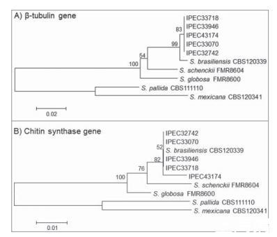 通過BLAST分析將分離株的β-微管蛋白和幾丁質合成酶序列與NCBI GenBank數(shù)據(jù)庫中的序列進行比較,將這些分離株鑒定為巴西利亞孢子絲菌,相似性為99-100%。此外,將所有分離株的部分β-微管蛋白和幾丁質合成酶序列與GenBank數(shù)據(jù)庫中可用的孢子絲菌復合體參考菌株進行比較和系統(tǒng)發(fā)育分析,結果顯示與巴西利亞孢子絲菌相似,并且兩個基因均顯示出高bootstrap支持值(圖3A和B)。分離株5的部分幾丁質合成酶序列與前4株分離株相比有一個2-bp的多態(tài)性(位置109 A/C和151 G/C),表明該分離株在系統(tǒng)發(fā)育分析中存在變異性。獲得的β-微管蛋白和幾丁質合成酶編碼基因序列已存入GenBank數(shù)據(jù)庫,登錄號為KM222420至KM222429。