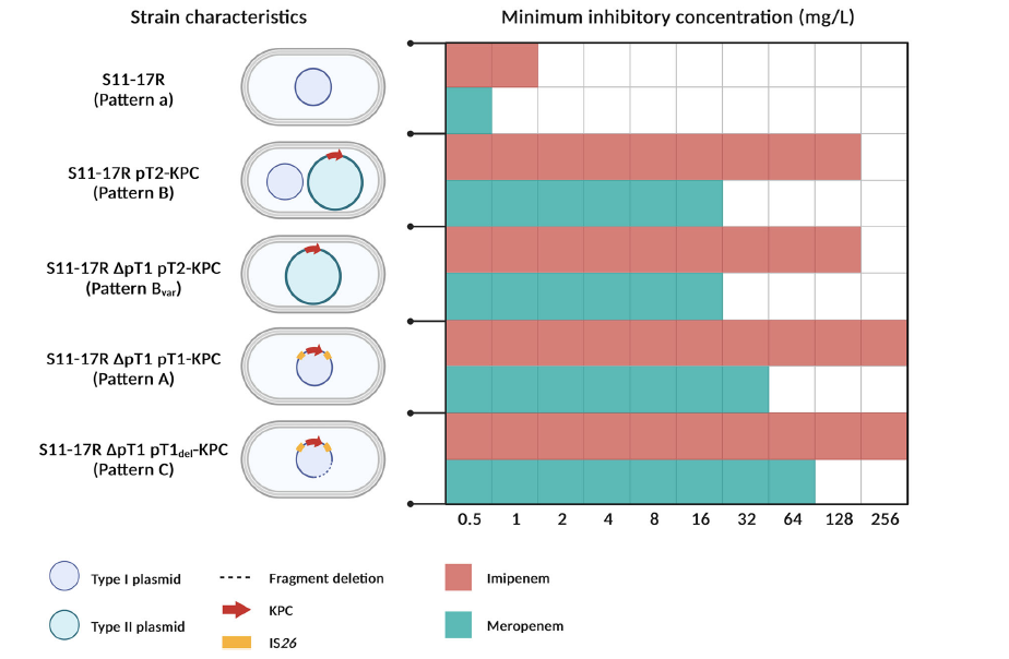 產(chǎn)肺炎碳青霉烯酶的銅綠假單胞菌(KPC-PA)分離株在中國迅速擴(kuò)增,尤其是高??寺T463。旨在探索推動ST463克隆成功的KPC相關(guān)質(zhì)粒的進(jìn)化。本研究對2011—2020年收集的1258株臨床銅綠假單胞菌菌株進(jìn)行全基因組測序,識別出106株ST463-PA菌株,其中KPC的檢出率為90.6%。研究發(fā)現(xiàn)在早期(2011—2012年),ST463-PA獲得了編碼KPC的II型(pT2-KPC)或I型質(zhì)粒(pT1-KPC)以克服碳青霉烯類抗生素的壓力。2012—2017年間,由于pT1-KPC質(zhì)粒具有較低的適應(yīng)性成本和IS26驅(qū)動的blaKPC擴(kuò)增能力,其成為主導(dǎo)質(zhì)粒。到2017—2020年,pT1-KPC質(zhì)粒發(fā)生大片段缺失,形成了pT1del-KPC質(zhì)粒。該質(zhì)粒具有更低的適應(yīng)性成本、增強(qiáng)的blaKPC-2基因穩(wěn)定性和更大的拷貝數(shù)靈活性,同時保持了水平傳播能力。因此pT1del-KPC質(zhì)粒最終取得成功,使ST463成為中國的主要ST。研究還評估了不同質(zhì)粒模式在ST463遺傳背景下的適應(yīng)性成本,并發(fā)現(xiàn)攜帶pT1del-KPC質(zhì)粒的菌株在無抗生素或高濃度美羅培南條件下比攜帶pT1-KPC質(zhì)粒的菌株具有更高的適應(yīng)性。在低濃度美羅培南壓力下,pT1del-KPC質(zhì)粒通過增加質(zhì)??截悢?shù)來放大blaKPC-2基因,而pT1-KPC質(zhì)粒則通過IS26介導(dǎo)的blaKPC-2基因擴(kuò)增來響應(yīng)。這些發(fā)現(xiàn)強(qiáng)調(diào)了進(jìn)化壓力推動ST463優(yōu)勢的形成,并強(qiáng)調(diào)了需要有針對性的策略來控制其傳播和抗生素抗性的發(fā)展。