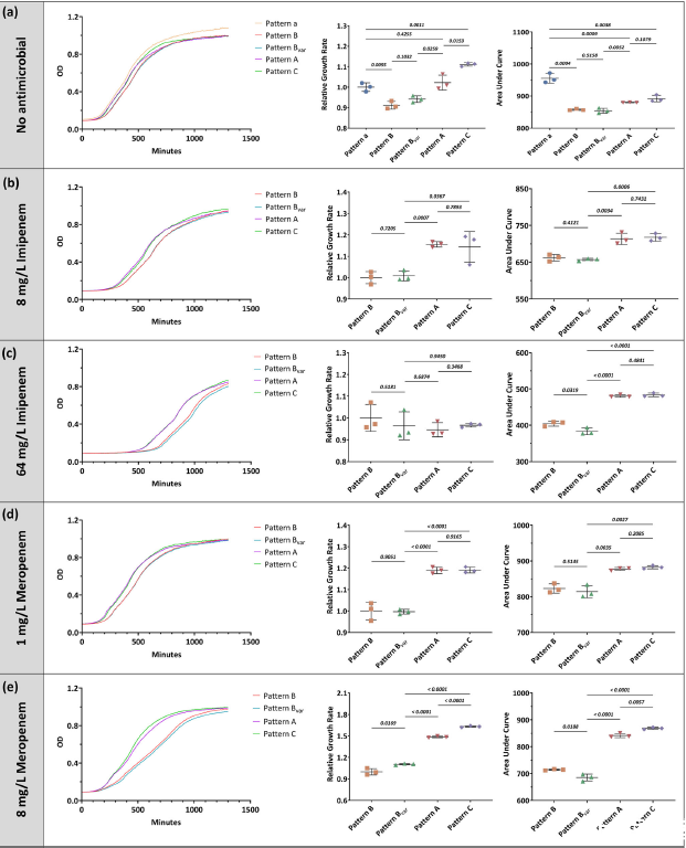 圖4、實(shí)驗(yàn)性ST463菌株中與不同KPC相關(guān)質(zhì)粒相關(guān)的適應(yīng)性成本。測試了各種條件下的生長過程:a)無抗生素、b)8 mg/L亞胺培南、c)64 mg/L亞胺培南、d)1 mg/L美羅培南和e)8 mg/L美羅培南。面板中的每個數(shù)據(jù)點(diǎn)對應(yīng)于從三個技術(shù)重復(fù)(n=3個生物獨(dú)立樣本)計(jì)算出的一個生物重復(fù)。