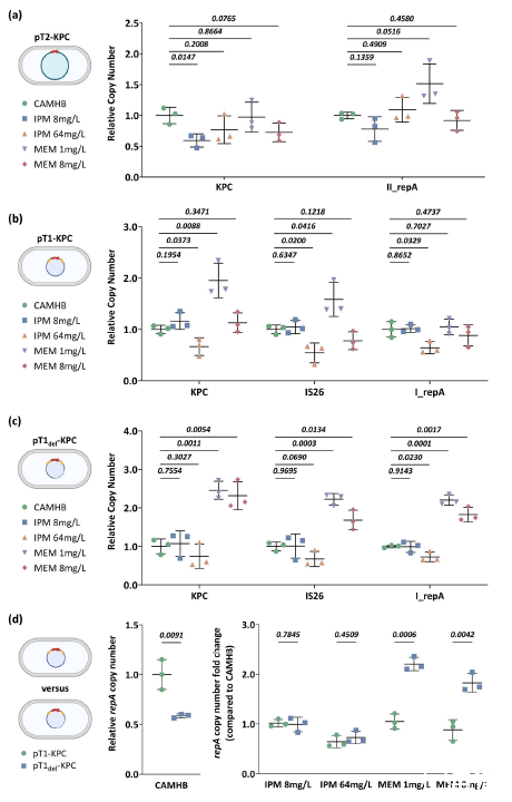 圖5、不同碳青霉烯類壓力下的基因拷貝數(shù)變化。a-c)pT2-KPC、pT1-KPC和pT1del-KPC質(zhì)粒的基因拷貝數(shù)。d)pT1-KPC和pT1 del-KPC質(zhì)粒之間的比較。面板中的每個數(shù)據(jù)點(diǎn)對應(yīng)于從三個技術(shù)重復(fù)(n=3個生物獨(dú)立樣本)計(jì)算出的一個生物重復(fù)。
