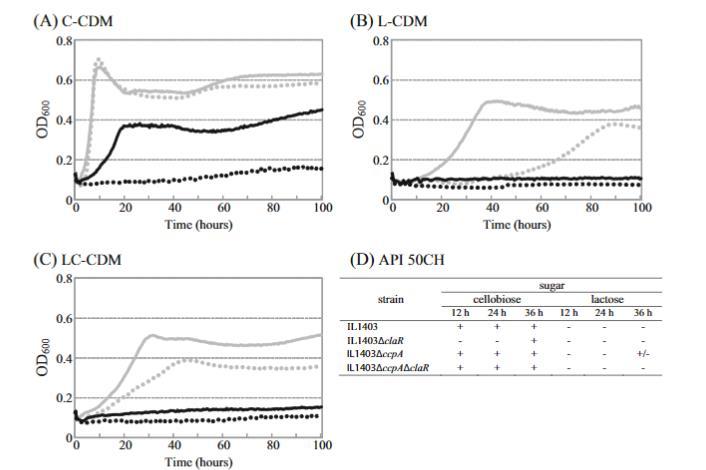 通過實時定量PCR相對定量基因表達 對于實時定量PCR(RT-qPCR),使用TRI Reagent(Sigma)按照制造商的說明,從25 ml在指數(shù)生長中期(OD600=0.6)收獲的IL1403野生型菌株及其突變體(IL1403△ccpA和IL1403△claR)培養(yǎng)物中分離總RNA。細胞在G-CDM、C-CDM、Gal-CDM、A-CDM或GalC-CDM中生長。從至少三個獨立培養(yǎng)物中提取RNA。