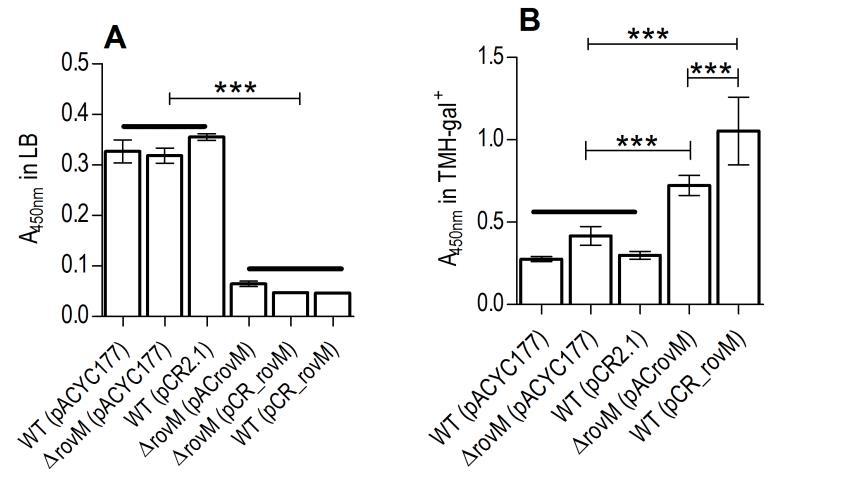 當(dāng)在TMH-gal+培養(yǎng)基中培養(yǎng)時(shí),野生型(pCR_rovM)和ΔrovM(pACrovM)菌株產(chǎn)生的生物膜量相對(duì)于攜帶空質(zhì)粒的野生型和ΔrovM突變株要多。不同的是,在TMH-gal+培養(yǎng)基中,觀察到較少的附著生物膜并不是造成這種差異的原因。