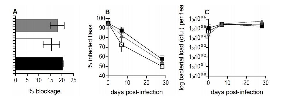 因此,評(píng)估了鼠疫耶爾森菌ΔrovM突變株成功感染跳蚤并產(chǎn)生生物膜阻塞的能力。在跳蚤感染期間,野生型、ΔrovM突變體和互補(bǔ)突變體ΔrovM(pACrovM)菌株表現(xiàn)出可比較的生物膜阻塞、感染率、每只跳蚤的平均細(xì)菌負(fù)荷和跳蚤死亡率(數(shù)據(jù)未顯示)。