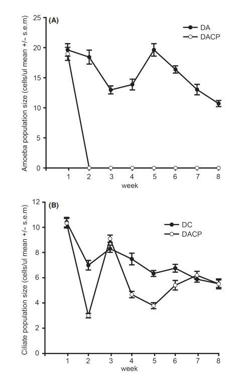 在多敵害處理中,阿米巴細胞在第一周后無法在暗場顯微鏡下觀察到。它們在單一敵害處理中持續(xù)存在,并且也隨時間下降(敵害F1,282=561.079,P<0.001,時間F8,282=28.687,P<0.001,時間x敵害F24,282=14.075,P<0.001;圖4B)。