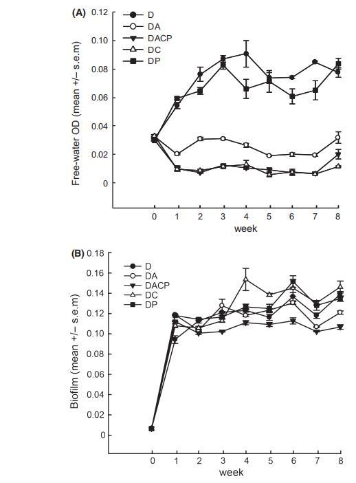 附著的生物膜量在第一周內迅速增加(圖2B)。此后,細菌敵害對表面附著生物膜生物量的影響取決于敵害身份和時間(敵害:F4,159=55.18,P<0.0001;時間:F7,159=40.68,P<0.001;時間x敵害:F28,159=7.60,P<0.001)。生物膜生物量最大的長期敵害誘導損失出現在所有三種敵害類型都存在的情況下,而阿米巴在最后三周對生物膜生物量具有中等的負面影響。噬菌體和纖毛蟲沒有影響,或者甚至短暫地增加了生物膜生物量。