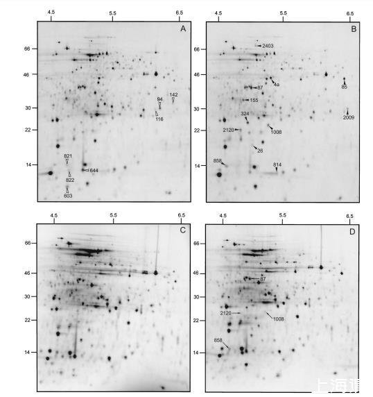 SMHK11的酸刺激子。通過(guò)比較暴露于pH 7.5和5.5條件下30分鐘的總細(xì)胞標(biāo)記蛋白的二維凝膠電泳,分析了NG8和SMHK11的ATR背后蛋白質(zhì)表達(dá)的變化。在這些實(shí)驗(yàn)中監(jiān)測(cè)的594個(gè)蛋白質(zhì)中,所有那些在酸暴露30分鐘后表達(dá)差異>2.0或<0.5的蛋白質(zhì)被分別分類為屬于NG8和SMHK11的酸刺激子。NG8的酸刺激子包括19個(gè)蛋白質(zhì),其中12個(gè)顯示表達(dá)增加,7個(gè)顯示表達(dá)減少(圖7A和B;表3)。有趣的是,在酸沖擊后顯示表達(dá)增加的12個(gè)NG8蛋白質(zhì)中,有四個(gè)蛋白質(zhì)在突變菌株中沒(méi)有被誘導(dǎo)(圖7C和D;表3)。這些結(jié)果證實(shí),SMHK11在誘導(dǎo)酸應(yīng)激蛋白方面相對(duì)于親本菌株NG8存在缺陷,并證實(shí)hk11在可誘導(dǎo)的ATR中起著重要作用。