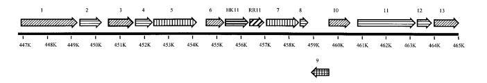 通過(guò)使用blastP算法將相鄰開(kāi)放閱讀框的推導(dǎo)氨基酸序列與GenBank數(shù)據(jù)庫(kù)進(jìn)行比較,對(duì)hk/rr11區(qū)域周?chē)倪z傳位點(diǎn)進(jìn)行了注釋。該位點(diǎn)的圖譜和描述如圖1所示。hk11基因位于變形鏈球菌基因組數(shù)據(jù)庫(kù)中的bp 455345至456349處,編碼一個(gè)推定的334個(gè)氨基酸的假設(shè)蛋白,預(yù)測(cè)分子量為38,113 Da。hk11 ORF與來(lái)自化膿性鏈球菌的推定的雙組分傳感器組氨酸激酶(登錄號(hào)AAK34394)(blast相似性得分=352);來(lái)自肺炎鏈球菌的推定的組氨酸激酶HK03(CAB54570)(blast得分=244);以及來(lái)自耐鹽芽孢桿菌的推定的組氨酸激酶BH1199(BAB04918)(blast得分=177)具有最高相似性。