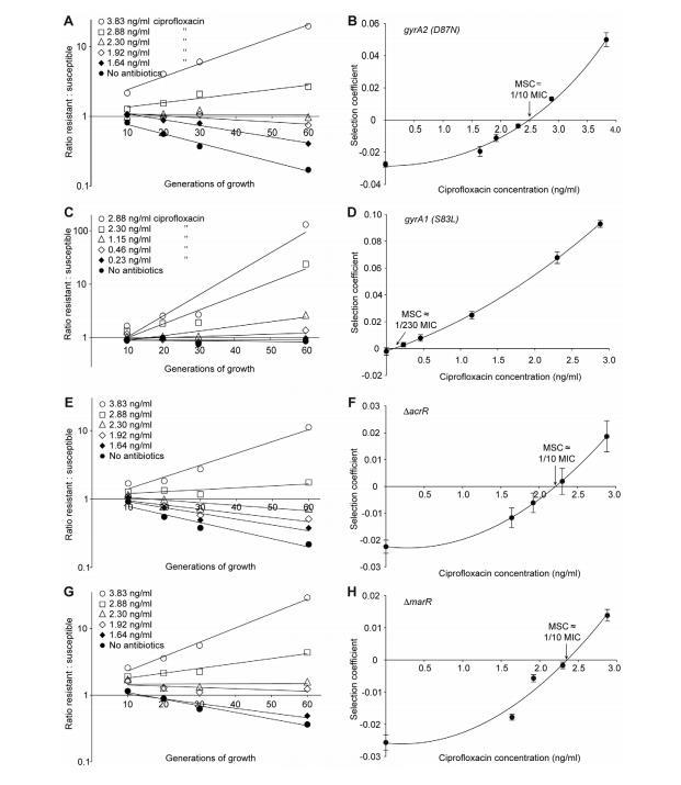 圖3. 敏感菌株與耐藥菌株在環(huán)丙沙星中的競(jìng)爭(zhēng)實(shí)驗(yàn)。圖中展示了不同濃度環(huán)丙沙星(A(gyrA2(D87N))、C(gyrA1(S83L))、E(DacrR)和G(DmarR))的實(shí)驗(yàn)結(jié)果,以及抗生素濃度對(duì)選擇系數(shù)的影響(B、D、F和H)。其中圖A、C、E、G基于單次實(shí)驗(yàn)數(shù)據(jù)(三次實(shí)驗(yàn)的平均值),而圖B、D、F、H則根據(jù)六次實(shí)驗(yàn)的選擇系數(shù)計(jì)算得出。圖中均標(biāo)注了均值的標(biāo)準(zhǔn)誤差。