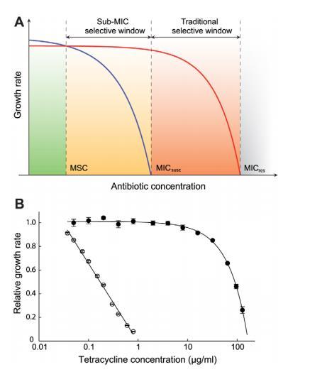 圖1. 抗生素濃度對(duì)生長(zhǎng)速率的影響。(A) 抗生素濃度與生長(zhǎng)速率關(guān)系的示意圖。綠色區(qū)域表示敏感菌株(藍(lán)色曲線)將勝過(guò)耐藥菌株(紅色曲線)的濃度區(qū)間。橙色(亞MIC選擇窗口)和紅色(傳統(tǒng)突變體選擇窗口)分別表示耐藥菌株將勝過(guò)敏感菌株的濃度區(qū)間。其中,MICsusc為敏感菌株的最低抑菌濃度,MICres為耐藥菌株的最低抑菌濃度,MSC為最低選擇濃度。(B) 腸炎沙門(mén)氏菌敏感株(空心圓)與耐藥株(實(shí)心圓)在四環(huán)素濃度下的相對(duì)指數(shù)生長(zhǎng)速率。圖中標(biāo)注了均值的標(biāo)準(zhǔn)誤差。相對(duì)生長(zhǎng)速率1.0對(duì)應(yīng)約1.8小時(shí)21。實(shí)驗(yàn)在37°C的穆勒-欣頓培養(yǎng)基中進(jìn)行。