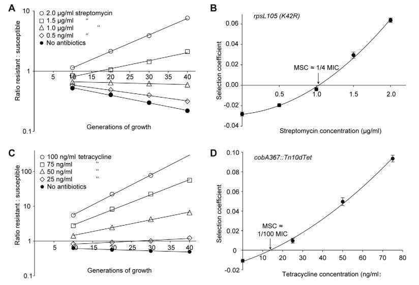 取決于抗生素和檢查的耐藥突變類型,MSC在敏感最小抑制濃度的1/4至1/230之間變化。對(duì)于鏈霉素,MSC值為敏感菌株最小抑制濃度的1/4(圖2B),對(duì)于四環(huán)素為1/100(圖2D),對(duì)于環(huán)丙沙星,根據(jù)特定耐藥突變,在敏感最小抑制濃度的1/10(圖3B)至1/230(圖3D)之間變化。這些值對(duì)應(yīng)絕對(duì)抗生素濃度1μg/ml(鏈霉素)、15 ng/ml(四環(huán)素)和2.5 ng/ml至100 pg/ml(環(huán)丙沙星)。以低初始比例耐藥突變體進(jìn)行的競(jìng)爭(zhēng)也顯示選擇系數(shù)與耐藥突變體初始頻率無(wú)關(guān)。即使初始頻率低至10??,也能觀察到與1:1比例相同的耐藥突變體富集(即相同選擇系數(shù))(比較圖2D和圖4E)。
