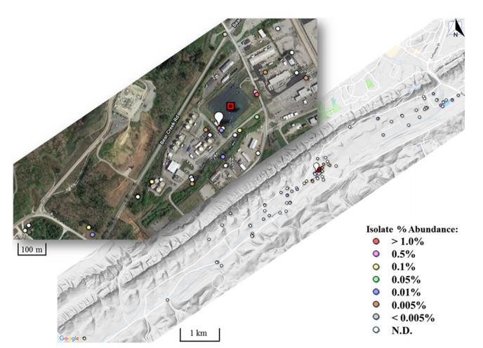每個井位置的ESV豐度顯示用于MT123(圖5)、MT049、MT058和MT094。如圖5所示,井跨越一個11公里x 1公里區(qū)域within Bear Creek Valley包含S-3池塘。分離四種ORR菌株(有ESV數(shù)據(jù)可用)的井用白色指針標記,S-3池塘用紅色方塊指示(圖5)。