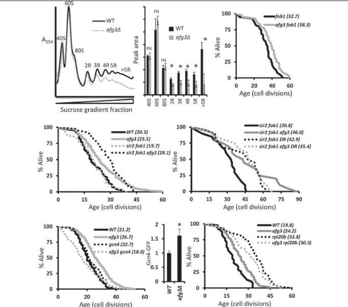 圖5、AFG3缺失通過Sir2獨立、Gcn4依賴機制減少細(xì)胞質(zhì)翻譯并延長壽命。(A)野生型BY4742和afg3Δ對數(shù)期酵母的代表性多核糖體譜。AFG3缺失導(dǎo)致核糖體從高翻譯mRNA轉(zhuǎn)移至未結(jié)合形式。曲線按80S自由亞基和雙核糖體(2R)之間的最小值歸一化。(B)三重復(fù)多核糖體的峰面積定量。*P<0.05,ns=無顯著性,誤差棒為SEM。(C–F,H)指定菌株的復(fù)制壽命曲線。括號為平均壽命。afg3Δ的壽命延長依賴Gcn4,但不依賴Sir2或Fob1;與rpl20bΔ或膳食限制(0.05%葡萄糖)組合不會產(chǎn)生疊加的壽命延長效果。(G)流式細(xì)胞術(shù)分析對數(shù)期基因組標(biāo)記Gcn4-GFP菌株。