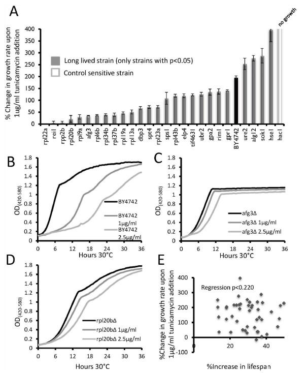 圖1、對圖尼霉素反應(yīng)的長壽菌株的生長抑制。(a)顯示了與野生型BY4742相比,相對生長抑制顯著變化(p<0.05)的長壽菌株。對照敏感菌株hac1Δ在培養(yǎng)基中未生長。b-d)0、1或5μg/mL圖尼霉素中野生型、rpl20bΔ和afg3Δ菌株的代表性生長曲線。(e)比較每個長壽突變體的復(fù)制壽命百分比變化與生長速率百分比變化的散點圖。