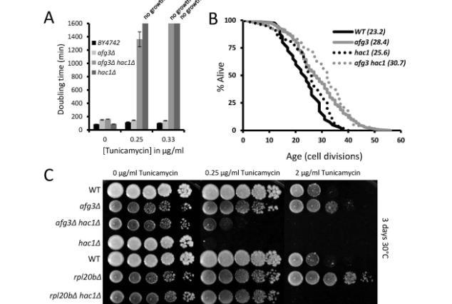 圖4、afg3Δ和rpl20bΔ菌株的Hac1獨立Tunicamycin抵抗性。(A)野生型BY4742、afg3Δ、hac1Δ和afg3Δhac1Δ菌株在不同Tunicamycin濃度下的平均倍增時間。afg3Δhac1Δ雙突變株在0.25μg/mL Tunicamycin下仍可生長(雖非常緩慢),而hac1Δ無法生長,表明存在Hac1獨立的Tunicamycin抵抗性。(B)顯示各菌株的復(fù)制壽命曲線,括號內(nèi)為平均壽命。afg3Δ的壽命延長不依賴Hac1。(C)指定菌株在不同Tunicamycin濃度下的點斑實驗。點斑按1:10稀釋,平板在30°C下培養(yǎng)3天。